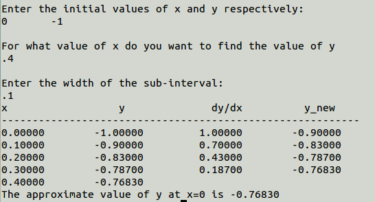//Eulers Method to solve a differential equation #include<iostream> #include<iomanip> #include<cmath> using namespace std; double df(double x, double y) //function for defining dy/dx { double a=x+y; //dy/dx=x+y return a; } int main() { int n; double x0,y0,x,y,h; //for initial values, width, etc. cout.precision(5); //for precision cout.setf(ios::fixed); cout<<"\nEnter the initial values of x and y respectively:\n"; //Initial values cin>>x0>>y0; cout<<"\nFor what value of x do you want to find the value of y\n"; cin>>x; cout<<"\nEnter the width of the sub-interval:\n"; //input width cin>>h; cout<<"x"<<setw(19)<<"y"<<setw(19)<<"dy/dx"<<setw(16)<<"y_new\n"; cout<<"----------------------------------------------------------\n"; while(fabs(x-x0)>0.0000001) //I couldn't just write "while(x0<x)" as they both are floating point nos. It is dangerous to compare two floating point nos. as they are not the same in binary as they are in decimal. For instance, a computer cannot exactly represent 0.1 or 0.7 in binary just like decimal can't represent 1/3 exactly without recurring digits. { y=y0+(h*df(x0,y0)); //calculate new y, which is y0+h*dy/dx cout<<x0<<setw(16)<<y0<<setw(16)<<df(x0,y0)<<setw(16)<<y<<endl; y0=y; //pass this new y as y0 in the next iteration. x0=x0+h; //calculate new x. } cout<<x0<<setw(16)<<y<<endl; cout<<"The approximate value of y at x=0 is "<<y<<endl; //print the solution. return 0; }